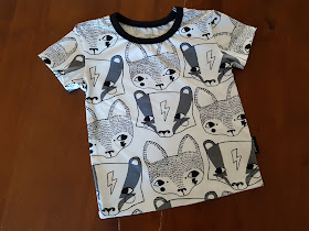 Kesäkuun lopussa vaihdeltiin taas kuukausittaista ompeluvaihtopakettia. Verson puodin kuosittama t-paita Myyry-kaavalla sai parikseen Kangaskapinam harmaasta collegesta Ottobren (4/17) Funny legs -kaavalla tehdyt housut.