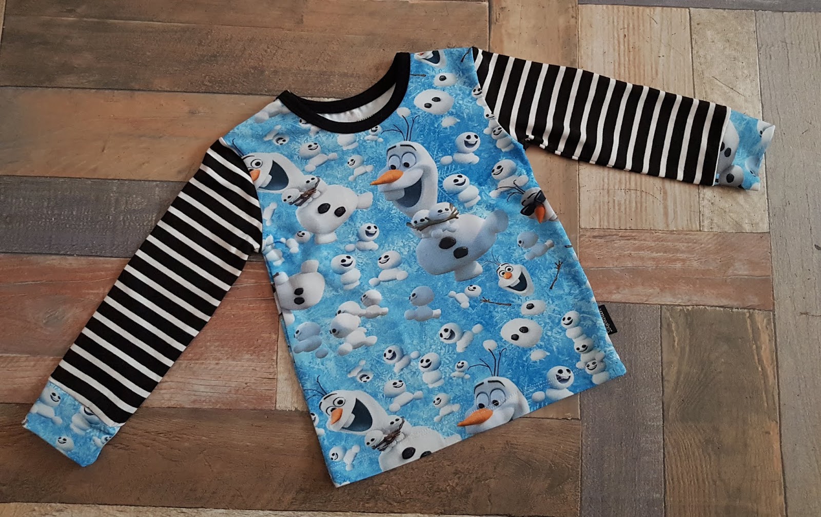 Olaf-kankaan pikkuneiti kaivoi itse kangaslaatikosta, jotein tein siitä raitaan yhdistäen paidan Paapiin Myyry-kaavalla. Hyvin samanlaisen paidan tein joku vuosi sitten esikoiselle, mutta se matkaa jo maailmalla. Raita on Bellabitiltä.