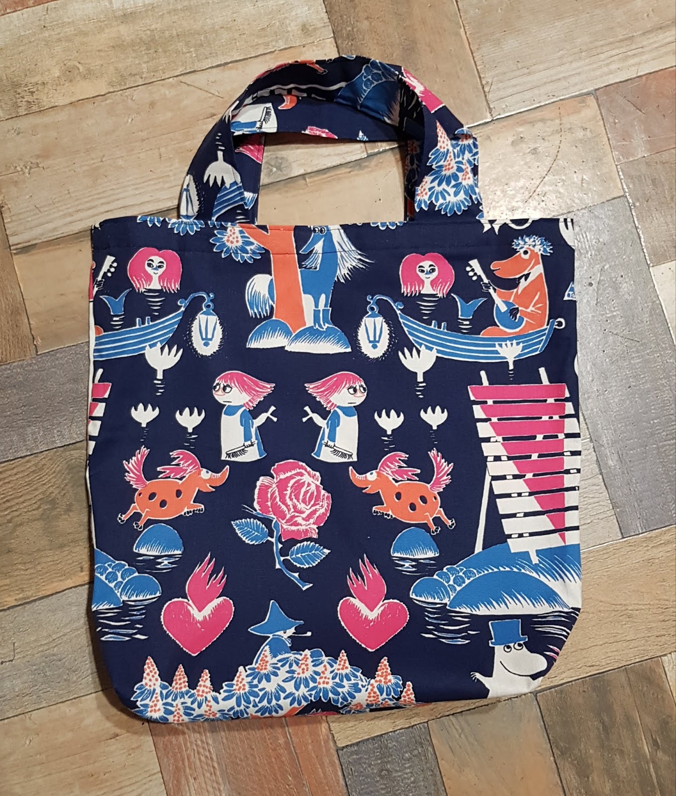 Muumi-sivuverhoja on vielä vähän jäljellä. Tein sinisestä kaksi ostoskassia. Tykkään itse, että kassi on reilua kokoa ja pohja on tehty tasaiseksi kulmien avulla, niinpä näissäkin. Jälkimmäinen kyllä vastusti käsittämättömän paljon, pahoittelut lahjan saajalle, ettei se nyt ollut ykkösluokkainen.