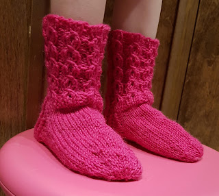 Toiset pinkit - unisukat - on neulottu samalla pinkillä langalla. Näissä väri näkyy oikeammin. Näissä on myöskin varressa 40 silmukkaa, jalkapöydällä 36. Nyt kuukauden ahkeran käytön jälkeen ovat sen verran lörpähtäneet, että seuraavia täytyy suunnitella.