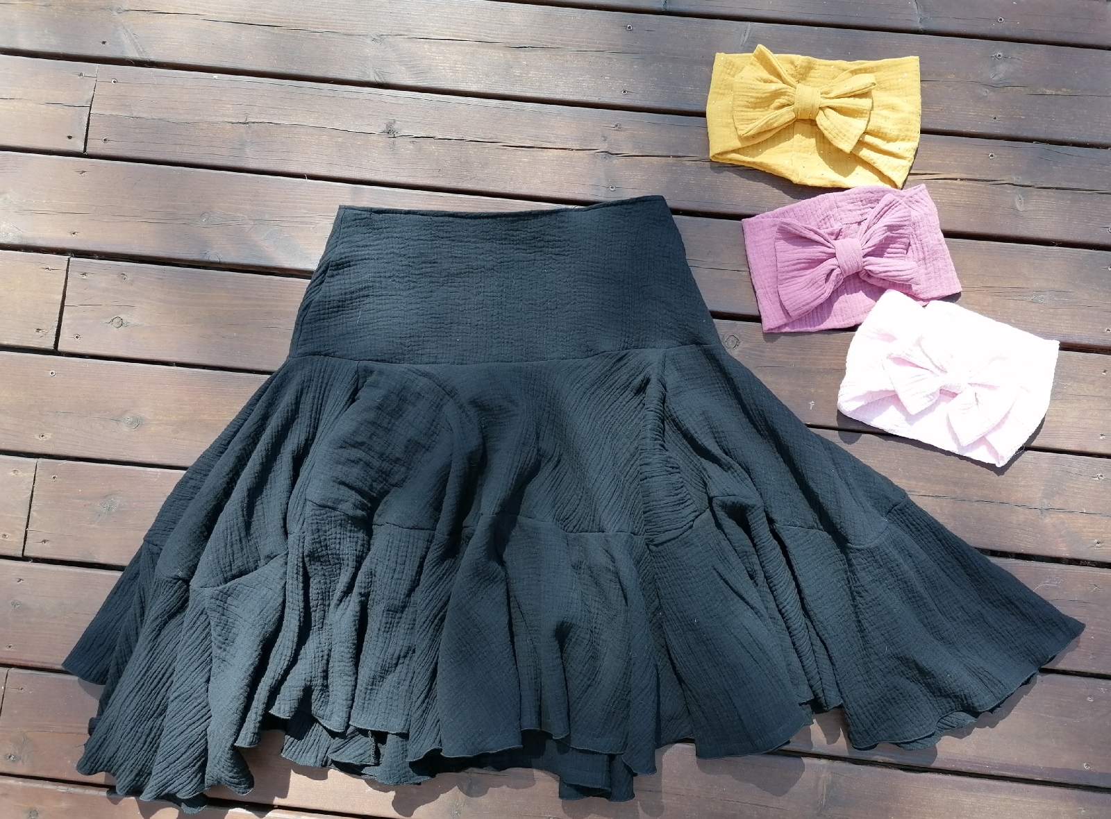 Ensikosketukseni double gauzeen, harsomaiseen puuvillakankaaseen, tapahtui tänä kesänä. Tein ensin omalle triolle pannat rusetein. Loppukesästä pääsin jälleen haastamaan itseni ja tein asiakastilauksena vanhan hameen mallilla uuden hameen.