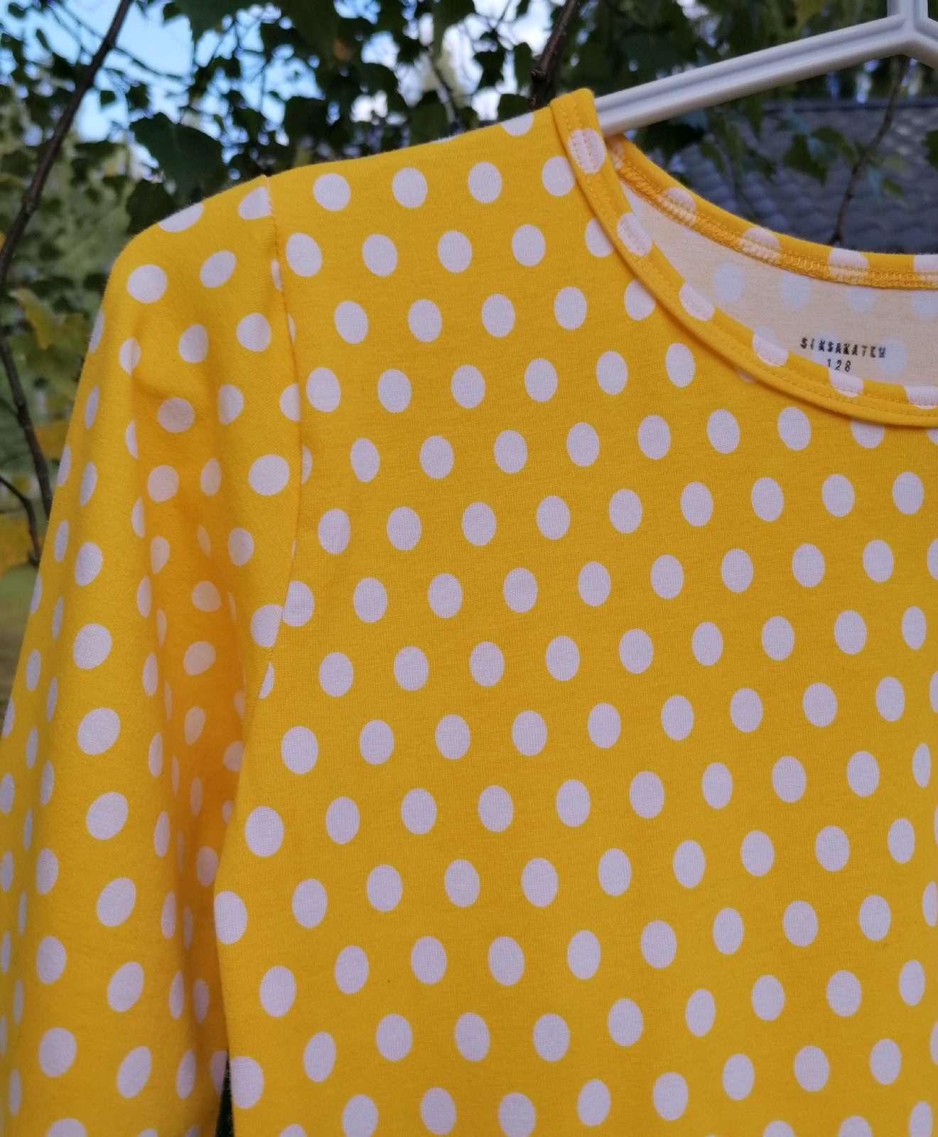 Viisivuotias sai keltapohjaisesta pilkusta mekon LillaLumin Amanda-kaavalla. Parasta tässä mekossa on tarpeeksi leveä helma ja vielä parempaa ovat mainiot taskut. Kaava on reiluhkoa kokoa, mutta mittasuhteet siinä ovat kohdallaan.