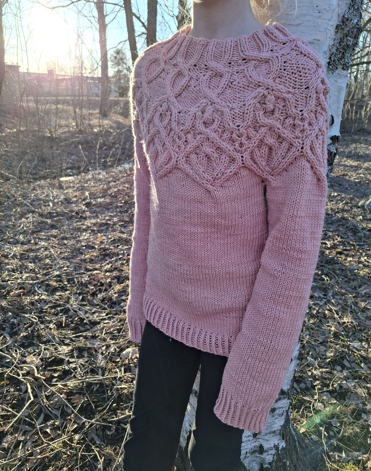 Neuloin alkuvuodesta keskineidille mintunsävyisen merinovillapaidan Novitan Syli-merinovillasta. Nyt oli samaisesta langasta esikoisen vuoro saada paitansa. Vaikka paita menikin nyt keväälle, lämmittää se kasvunvaransa puolesta tulevina syksyinä ja talvina.