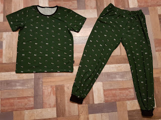 Pyjaman kaava on luultavasti alkujaan Ottobrestä. Housukaava tosin oli shortsipituutta, mutta pidensin ne käyttöhousuihin mallaten. Kangas on Vimman kärpäset.