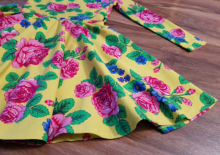 Esikoinen on jo kauan himoinnut kangashyllystäni keltaista Babushka Rosesia, joka on Ommellisen trikoo. Marraskuussa Suomen kädentaidon messuilta ostin Lalian pisteeltä Alice-kellohelmamekon kaavan ja testasinkin sitä nyt ensikertaa.