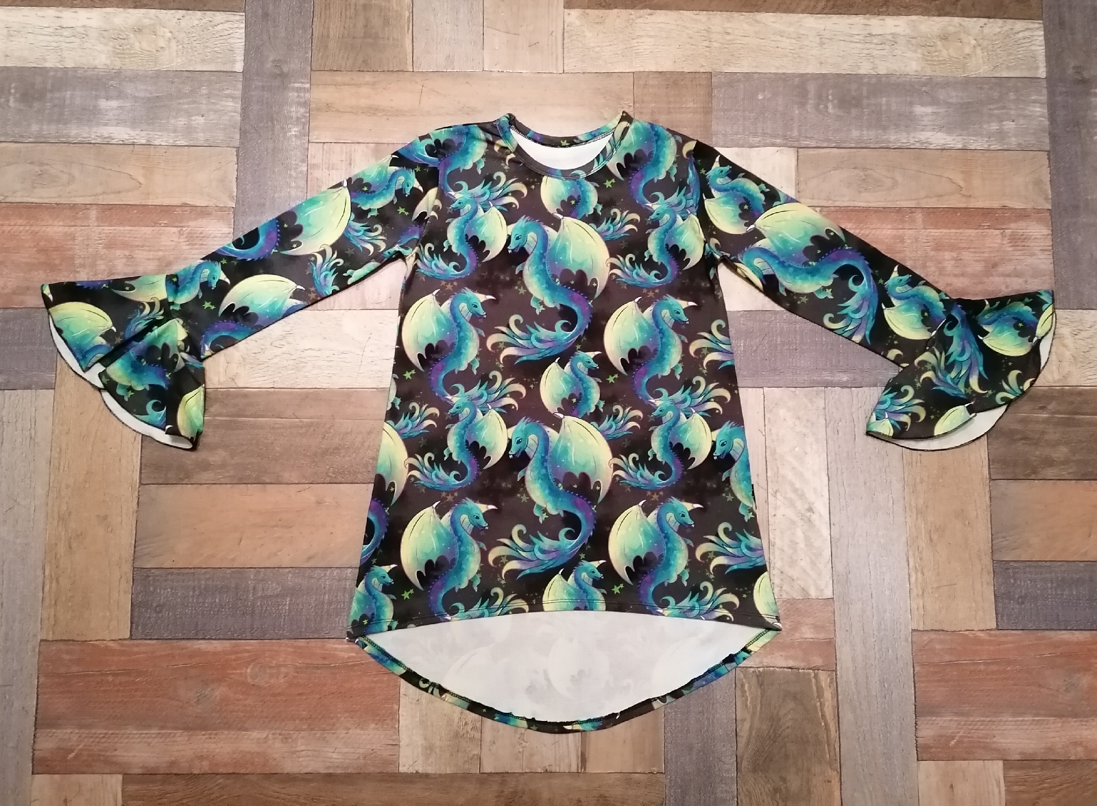 Ompelin tunikaan etukappaleen lyhemmäksi kuin takakappaleen, johon tein "pyrstön". Lohikäärmekuosi kaipasi minusta myös muuta jännää, joten tein hihoihin täyskelloiset kappaleet. Näistä taisi tulla tunikan The Juttu.