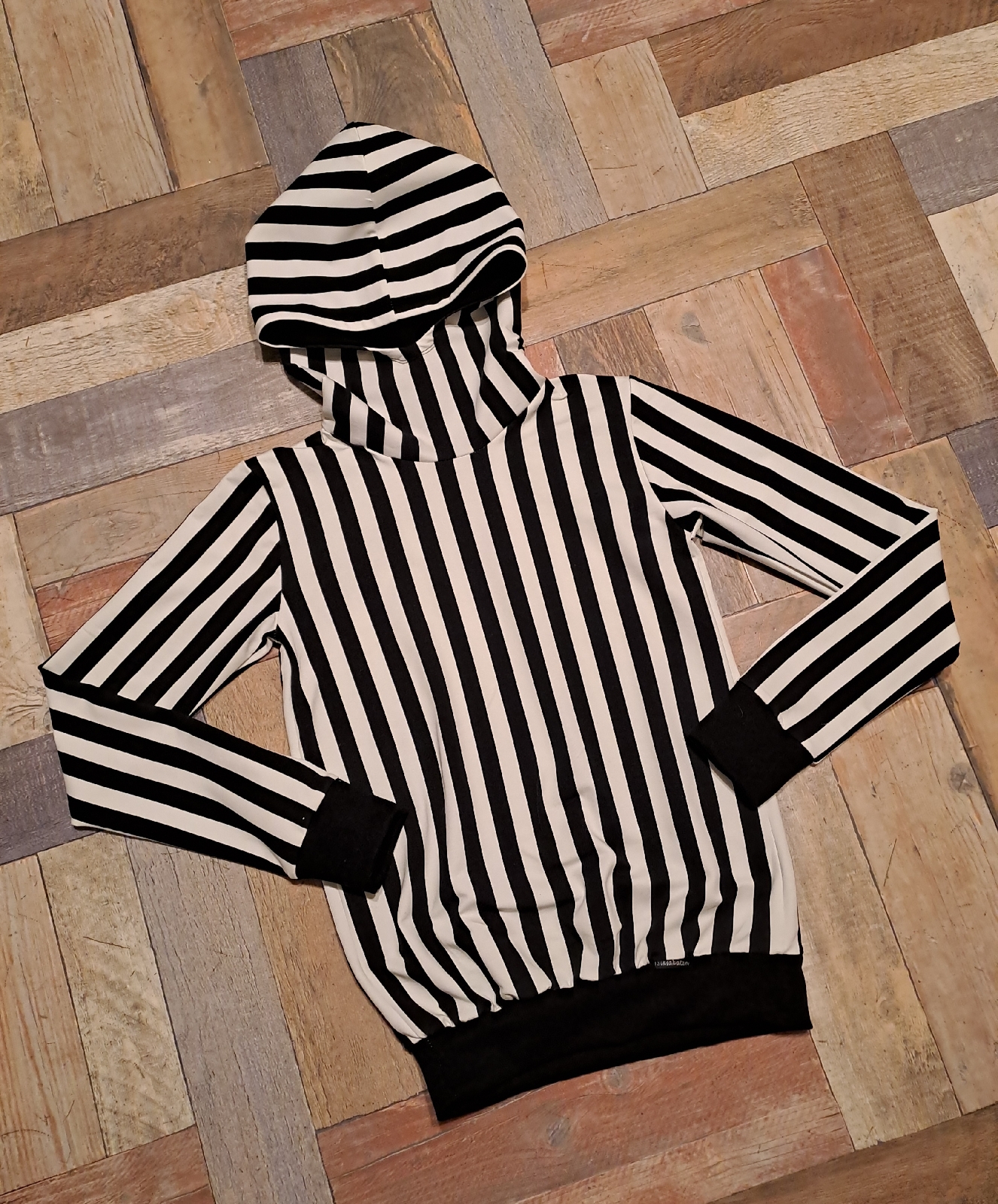 Ompelin varhaisteinille, vanhimmalle kummipojalleni joululahjaan tämän raitahupparin. Mustavalkea väri on rauhallinen, mutta juju on joustocollegen pystyraidoissa.